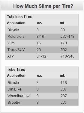 General tire and tube sizes and their required amounts are listed in the chart below and on our packaging. If you have large tires on your Motorcycle, ATV, Truck, Tractor or Passenger Vehicle, use our handy Slime Calculator (Application Table) to determine exactly how much Slime to install as your tire may require more than our general application amount