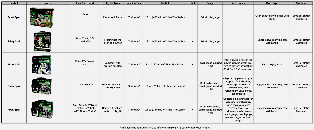 Use the chart below to determine which Slime Spair flat tire repair kit is best for you. (Click to Enlarge)